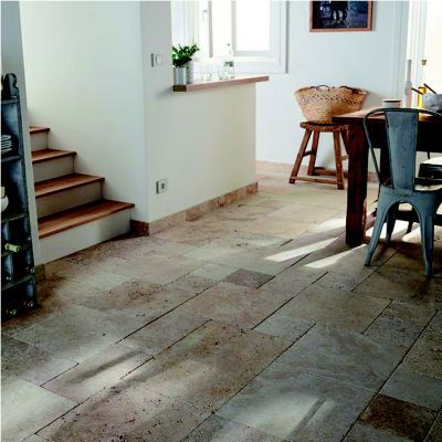 Dallage Pierres Naturelles Dallage Et Carrelage Chausson Materiaux: Gres Soft Travertin Colours Szary Ma Szkliwioną Powierzchnię.